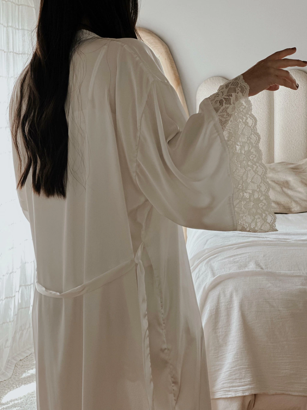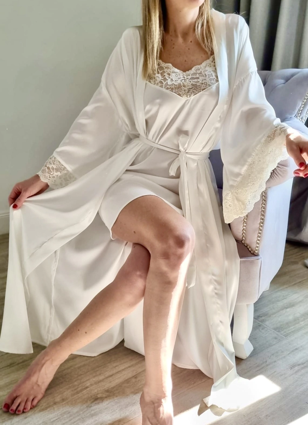 - Kimono largo de seda sintética importada color off white con detalles en encaje en color hueso.